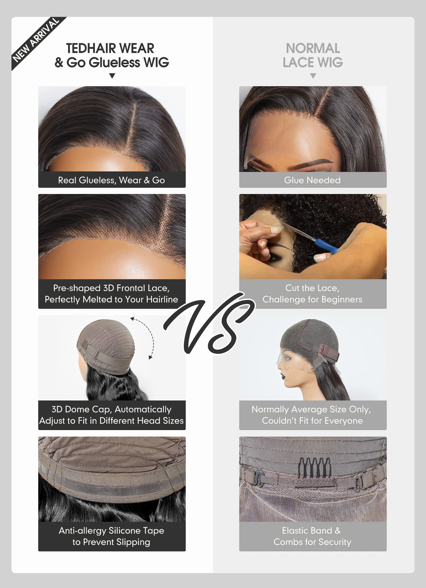 The New Innovation “Wear&Go Real Glueless Lace Wigs”:✔Pre-shaped 3D frontal lace, specifically designed to perfectly match your hairline✔Elastic wig cap, ensuring a comfortable fit for various head sizes while providing a secure hold✔Anti-allergy silicone tape to prevent slipping✔No combs are included, reducing friction and potential damage to natural hair